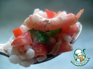 Подготовить продукты – креветки почистить, порезать. Сельдерей и перец покрошить мелкими кубиками.