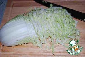 Пекинскую капусточку режем вдоль и одну половинку шинкуем.