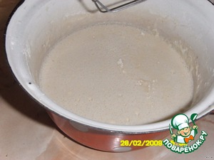 в кастрюлю наливаем теплую жидкость (полпорции), кладем желтки, взбиваем -