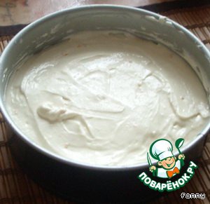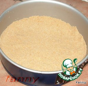 На дно формы диаметром 22 см положить пергамент, смазанный маслом. Массу из печенья и масла положить в форму и разровнять. -