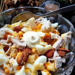 Все ингредиенты смешать, добавить сахар, соль и перец, всe заправить майонезом и сливками. Ввыложить в салатник, украсить орехами миндаля и веточками петрушки.