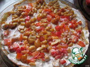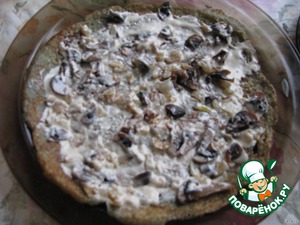 Смазываем наш блин соусом и выкладываеи половинку шампиньонов.