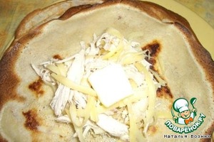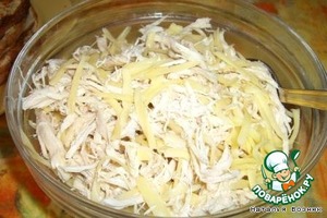 Масло растопить, смешать с грудкой, разобранной на волокна, добавить сыр (натертый на терке) - начинка готова!