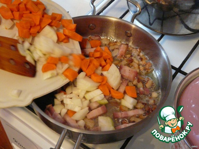 Поджарить сало, затем туда же грудинку, затем лук и морковь. -
