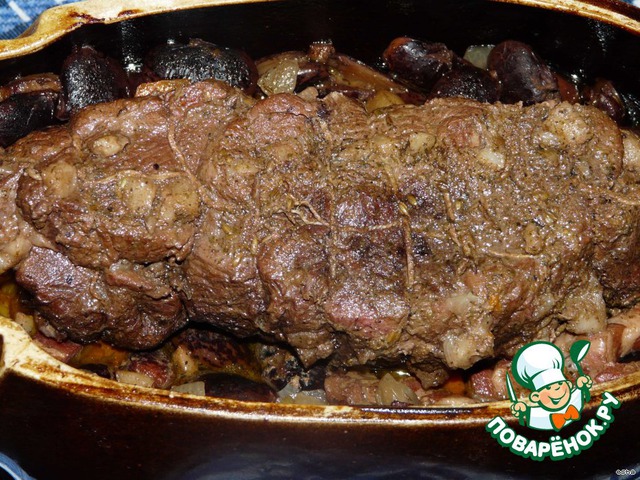 Сверху положить кусок мяса. Залить оставшимся маринадом, долить горячего бульона и поставить в духовку на 1,5-2 часа на маленький огонь. Хорошо быть фермером. Особенно зимой :).