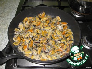 В разогретую с оливковым маслом сковороду выкладываем мидии. Обжариваем минут 5 на большом огне.