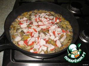 Добавить нарезанное крабовое мясо. Жарить еще 5 минут, огонь убавить.