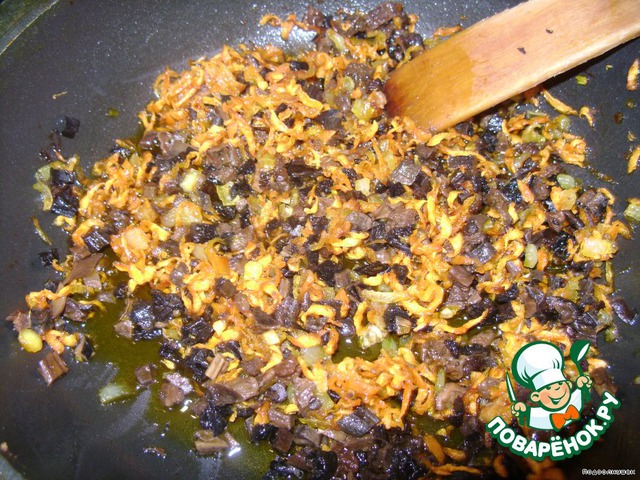 Грибы сушёные замочить на ночь. Хорошенько промыть. Отварить грибы в подсоленной воде в течении 40мин., затем вытащить их и порезать. Отварить перловку. Морковь и лук спассеровать на растительном масле и добавить порезанные грибы в конце. С грибами жарить 1мин.