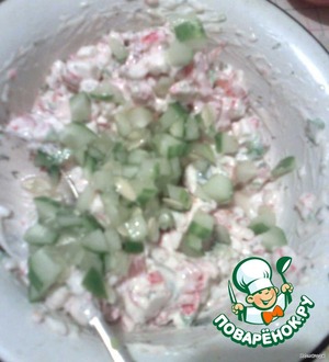 .. добавляем плавленный сыр и майонез (чтобы крабовые палочки напитались, пока мы будем резать огурец и помидор)...