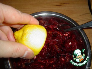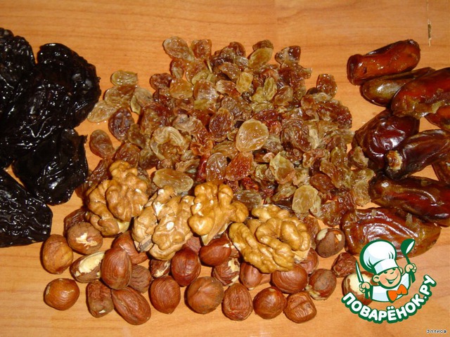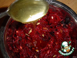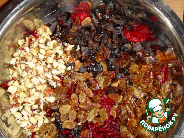 Чернослив, орехи, финики измельчаем и добавляем к свекле.