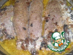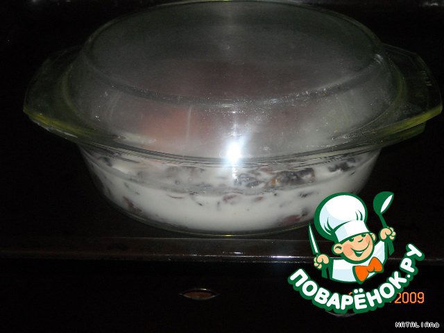 сметану развести теплой водой, немного посолить и залить наши рулетики(у меня оставались грибочки-их можно посыпать сверху)