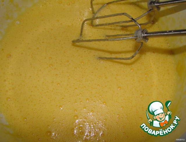 отдельно взбиваем желтки и одно яйцо с сахаром... затем смешиваем яйца с шоколадно-сливочной массой... -