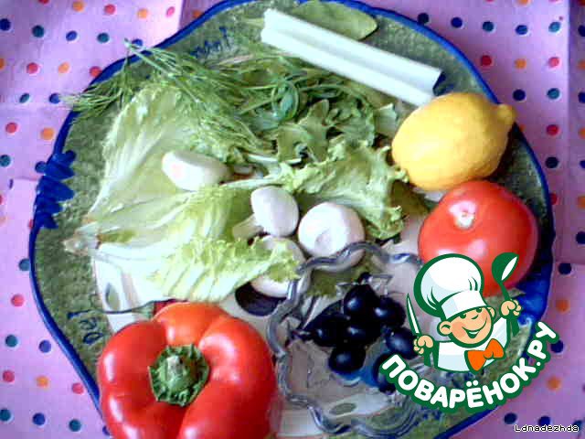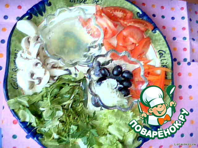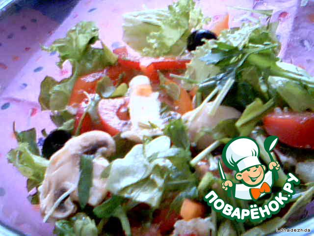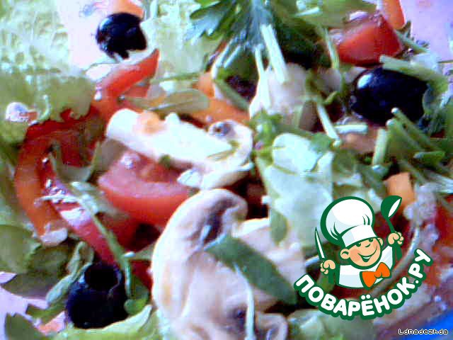 • Перемешиваем. Солим в последнюю очередь. Выкладываем красиво, грибки, маслины, листья салата.