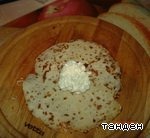 В серединку блинчика положить начинку. У меня блинчики были с сыром и чесноком.