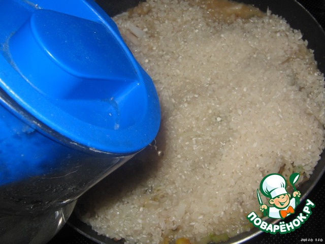 • Засыпаем промытый рис. Я его ещё предварительно минут на 20 залила холодной водой. Потом воду слила и промыла рис ещё раз.