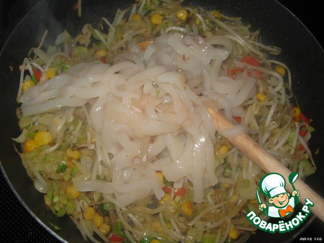 • И добавляем нарезанные соломкой кальмары. У меня были очищенные, но если нет, то их нужно очистить (под холодной водой это очень легко сделать) и удалить внутренности, а потом хорошо промыть. Обжаривать кальмары практически не нужно. Просто всё хорошо перемешиваем.