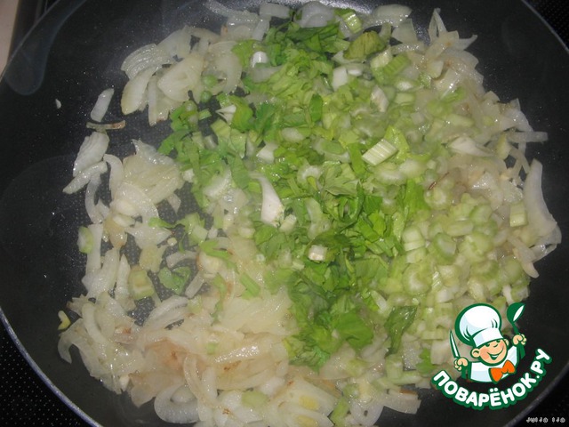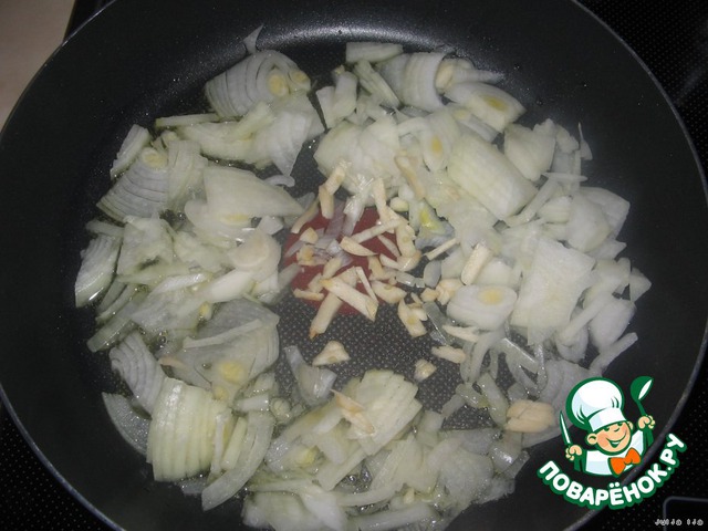 • Лук нарезать соломкой, чеснок тоже нарезать, обжарить всё на оливковом масле пару минут.