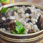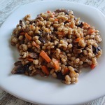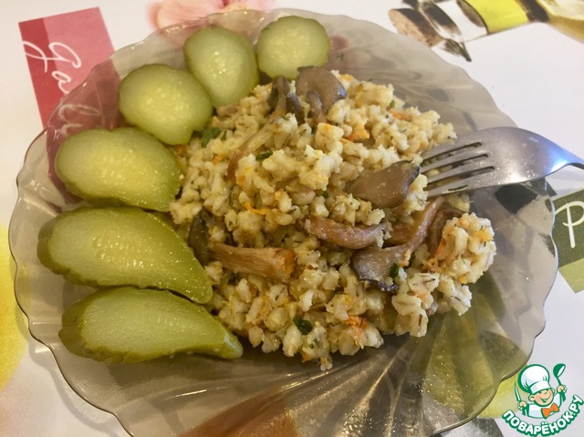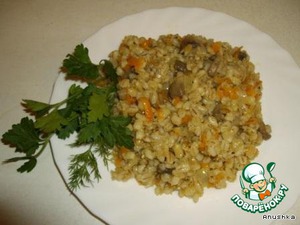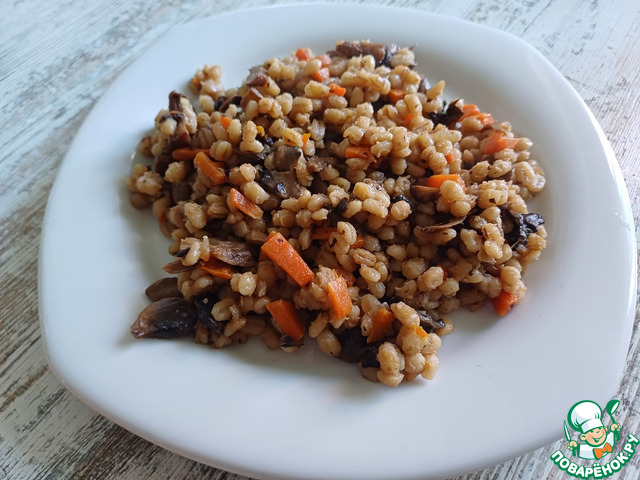 Проверить готовность перловки, если есть необходимость слить лишнюю воду. Поставить на минимальный огонь, добавить обжаренные грибы, морковку и лук. Добавить приправы, тщательно перемешать не снимая с огня до полного выпаривания жидкости. Выключить огонь, накрыть крышкой и дать настояться минут 10.