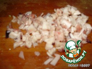 Копченые кольца кальмара нарезать небольшим кубиком.