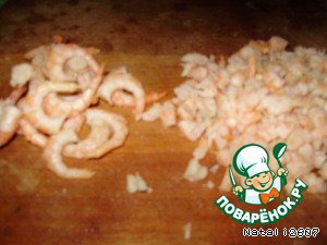 Если креветки не вареные, то отварить так, чтоб когда креветка поменяет цвет с серого на розовый, то она готова. Если креветки варено-мороженные, то залить пару раз кипяченой водой. Таким образом креветки будут нежесткими. Охладить и очистить от панциря, головы и икры. Разделить на две части, одна для украшения, а вторую нарезать небольшими кусочками.