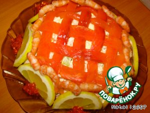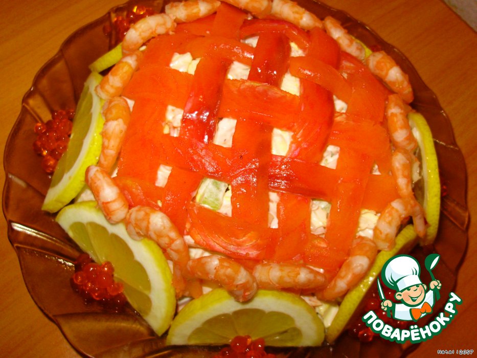 Салат выложить горкой на плоское блюдо, придать округлую форму. Сверху выложить сеточкой нарезанную на полоски копченую форель. С боков по всему периметру выложить нарезанный лимон дольками, креветки и украсить икрой.