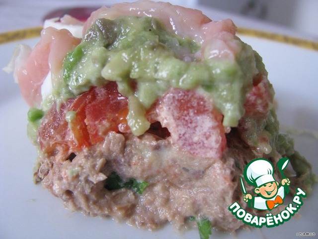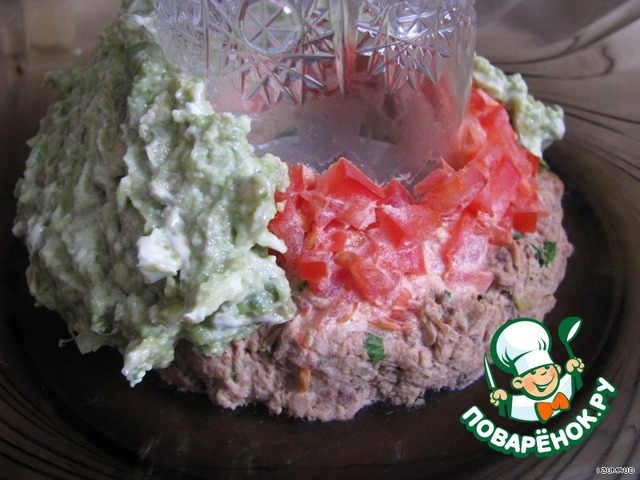 "зашпаклевать" смесью из авокадо слои из тунца и помидор -