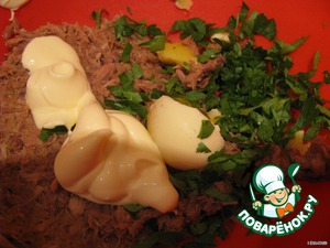перемешать тунец+желток+зелень петрушки+майонез