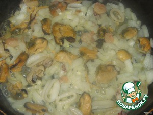 Морской коктейль разморозить, обжарить на растительном масле вместе с репчатым луком.