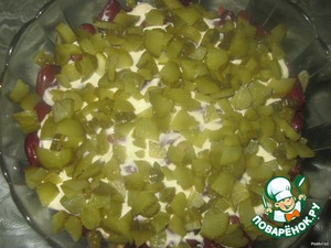 Выкладываем ингредиенты в салатник слоями, промазывая майонезом: