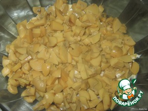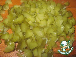 огурцы и грибы (1 гриб оставить для украшения), нарезать кубиками. -