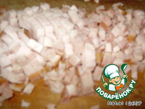 Ветчину, обжаренный лук и шампиньоны соединить.