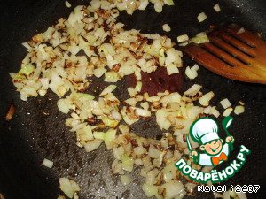 Почищенный репчатый лук нарезать кубиком и обжарить на растительном масле.