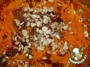 В морковь добавляем изюм и измельченные орехи.