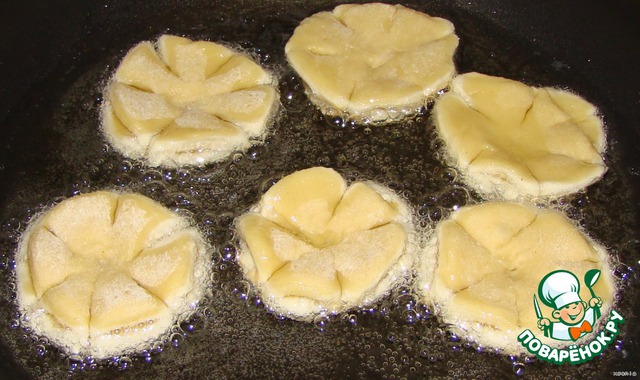 у нас бабушка такие делала. наз. их ,, розенцы,,. жарила во фритюре и когда закладывала в масло прокручевала их вилкай они тогда еше больше раскрывались и выглядели как розы . может пригодится