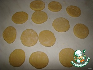 • Раскатайте тесто с помощью муки, с помощью небольшого стакана нарежем на кружочки.