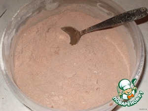Смешать всё сухое: муку просеять с разрыхлителем и какао, добавить сахар, соль, крахмал, перемешать.