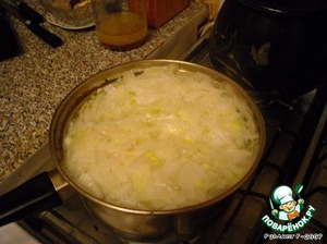 2 другие головки мы варим: закладываем в кипящую воду и варим 10-15 минут (не солим), когда лук опустится ко дну, это сигнал - скоро вынимать. Вынимайте шумовкой сразу в салатник на прожаренный лук. -
