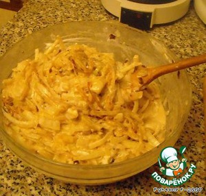 Затем добавляете сырую луковую нарезку, присаливаете по вкусу и кладете майонез (индивидуально, салат даст сок)