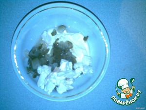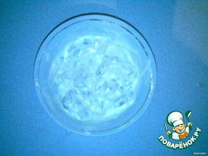 В пиале смешиваем майонез, маринованный огурец (я режу кубиками) и сыр (тоже кубиками). Вообще, огурец трут на терке и сыр не добавляют, но я сделала немного по-своему: ) -