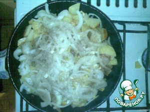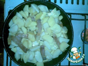 Когда картошка будет полуготовая, добавляем лук и только теперь солим и перчим. Если мы сделаем это раньше, то картошка превратится в кашу.