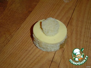 Из ломтика хлеба вырезать кружочек. Намазать его сливочным маслом и покрыть его сыром.