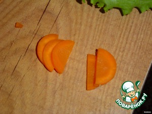 Нарезаем морковь поперек тонкими кусочками и при помощи выемок изготавливаем голову, плавники и хвосты.