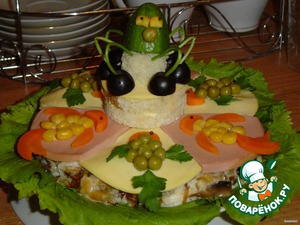 Усадить каракатицу в центр салата, сделать зрачки из кожи маслины и прикрепить нос-горошину.