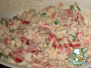 Этот рецепт наполовину импровизация, наполовину дитя Интернета. Название собственного приготовления. В роли жемчуга - маслины. Морепродукты - кальмары. На конкурс "Scarlett к 8 марта".