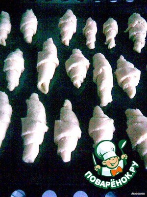 Выкладываем на сухой противень. Ставим в разогретую до 180 градусов духовку. Выпекать 20-25 минут. Рогалики должны зарумяниться.