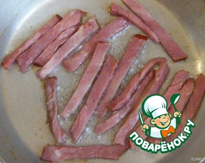 Бекон режем полосками, обжариваем до хрустящий корочки, выкладываем на бумажную салфетку и даем стечь.