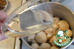 Отбираем крепкие, небольшие шампиньоны, заливаем вином+немного воды, добавляем соль, перец и тушим с закрытой крышкой на умеренном огне 10-15 мин.