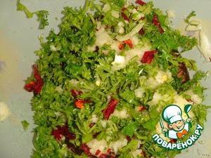Приготовить чесночную смесь: измельчить чеснок, петрушку, добавить красный перец (у меня сушеный острый перец - 1 стручок, я его измельчила, удалив семена), соль.