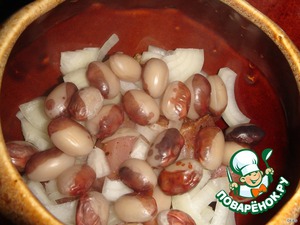 Следующим слоем заранее отваренная фасоль. Чтобы фасоль сварилась быстрее, я замачиваю ее с вечера, а затем при варке несколько раз сливаю воду, заливая холодной.