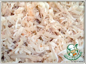 редис очистить от кожуры (у нас белый кот :-) ) и нарезать тонкой соломкой. -